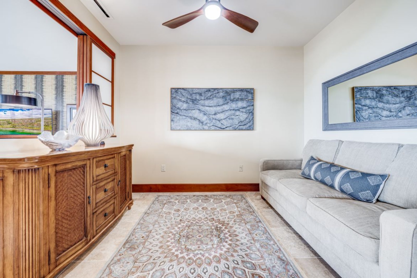 The open floor plan of Penthouse 207 creates a welcoming, airy environment. The living room is comfortably furnished for lounging and features a wall-mounted HDTV and DVD player for entertainment. Adjacent to the living area is a quiet den with shoji screen doors, offering a peaceful spot for reading or relaxing. The dining area flows into the gourmet kitchen, while sliding doors open onto the lanai, creating a seamless indoor-outdoor lifestyle.