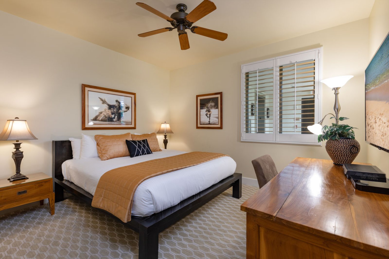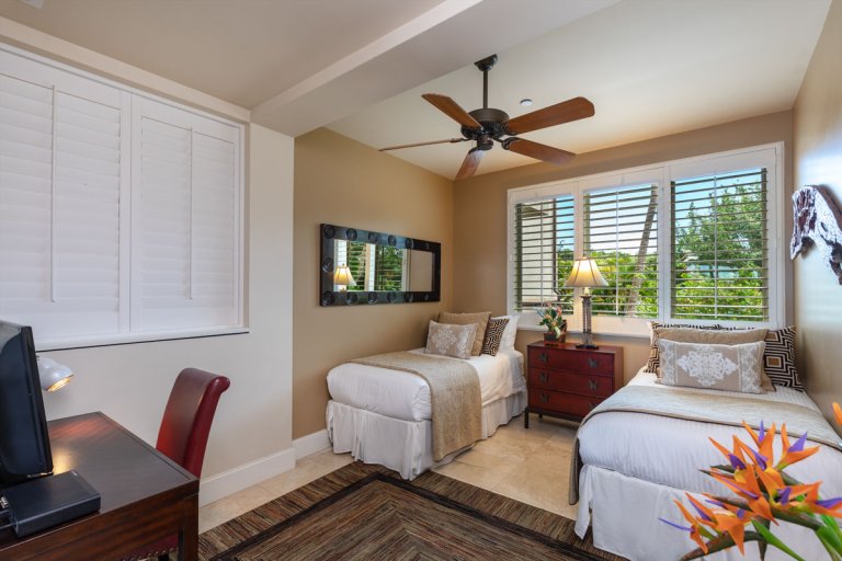 Bed: 2 Twin Beds w/Option as King Bed • Desk • Ceiling Fan