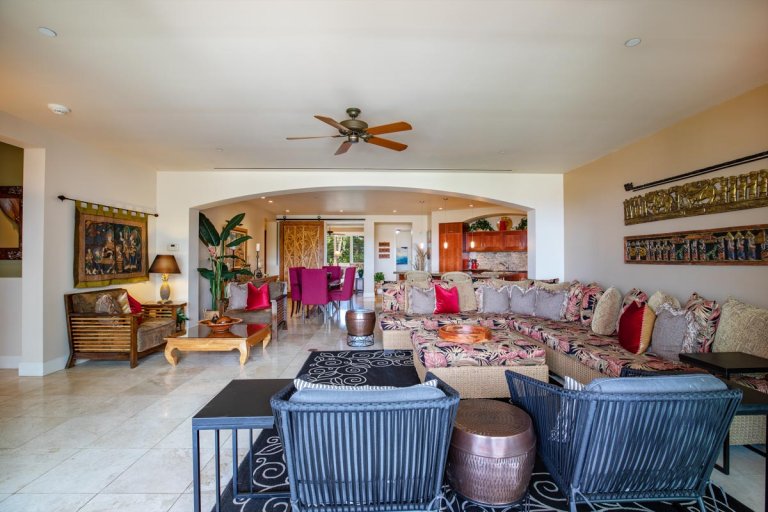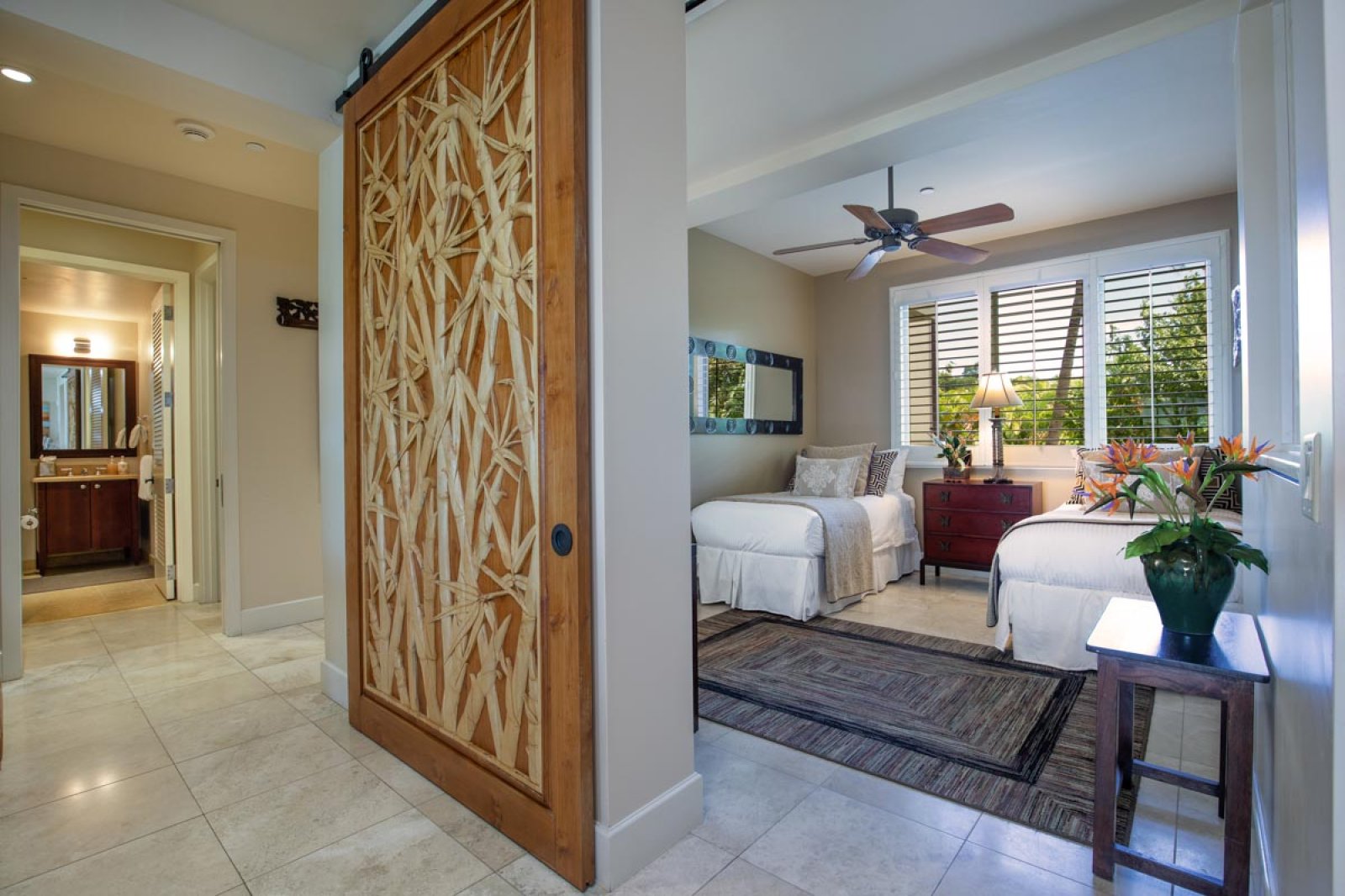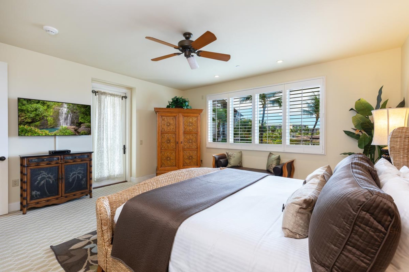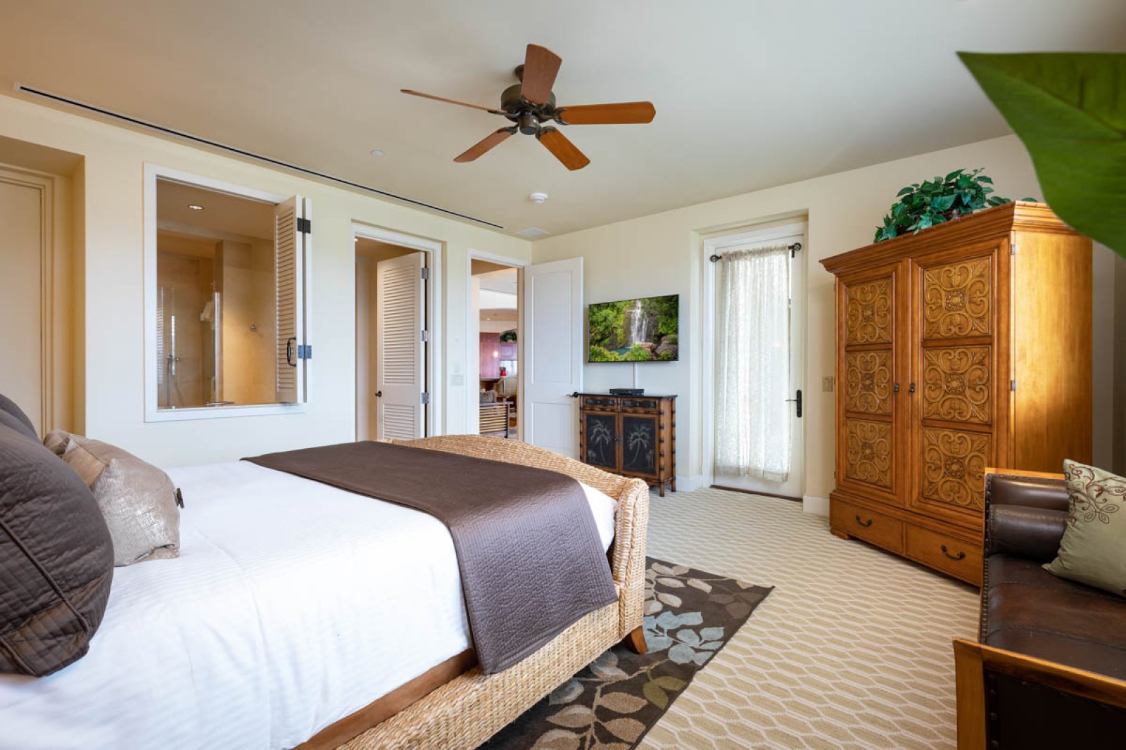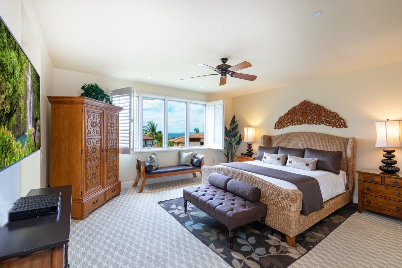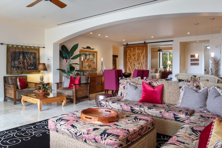 Designed for relaxed island living, the suite is filled with an international collection of art and artifacts that enhance the luxurious atmosphere. Every detail has been selected to create a warm, inviting space that feels like a private retreat.