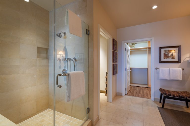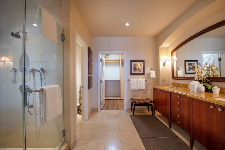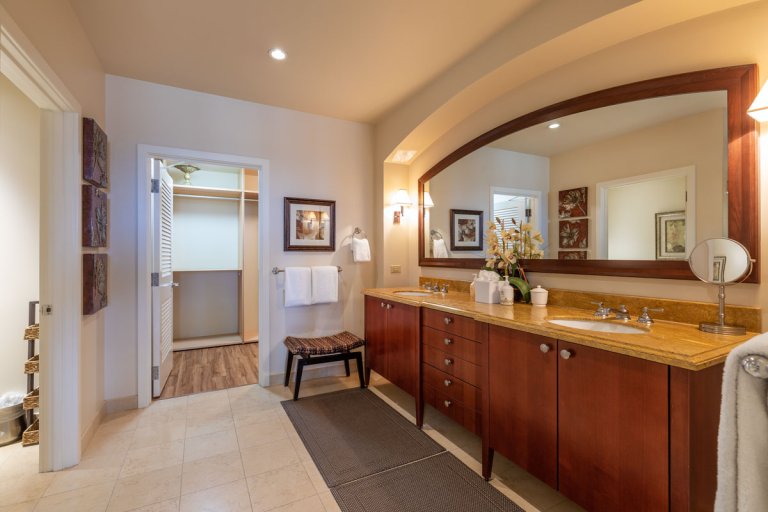 The master bedroom is tucked away near the living area and offers direct access to the lanai. The en-suite bathroom features luxury finishes and a serene spa-like atmosphere.