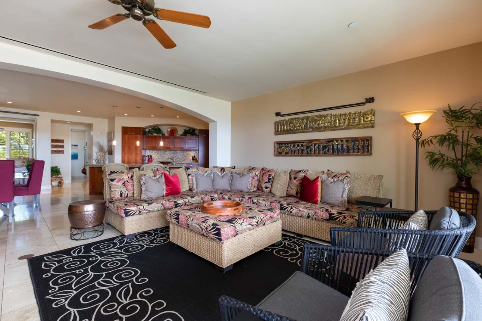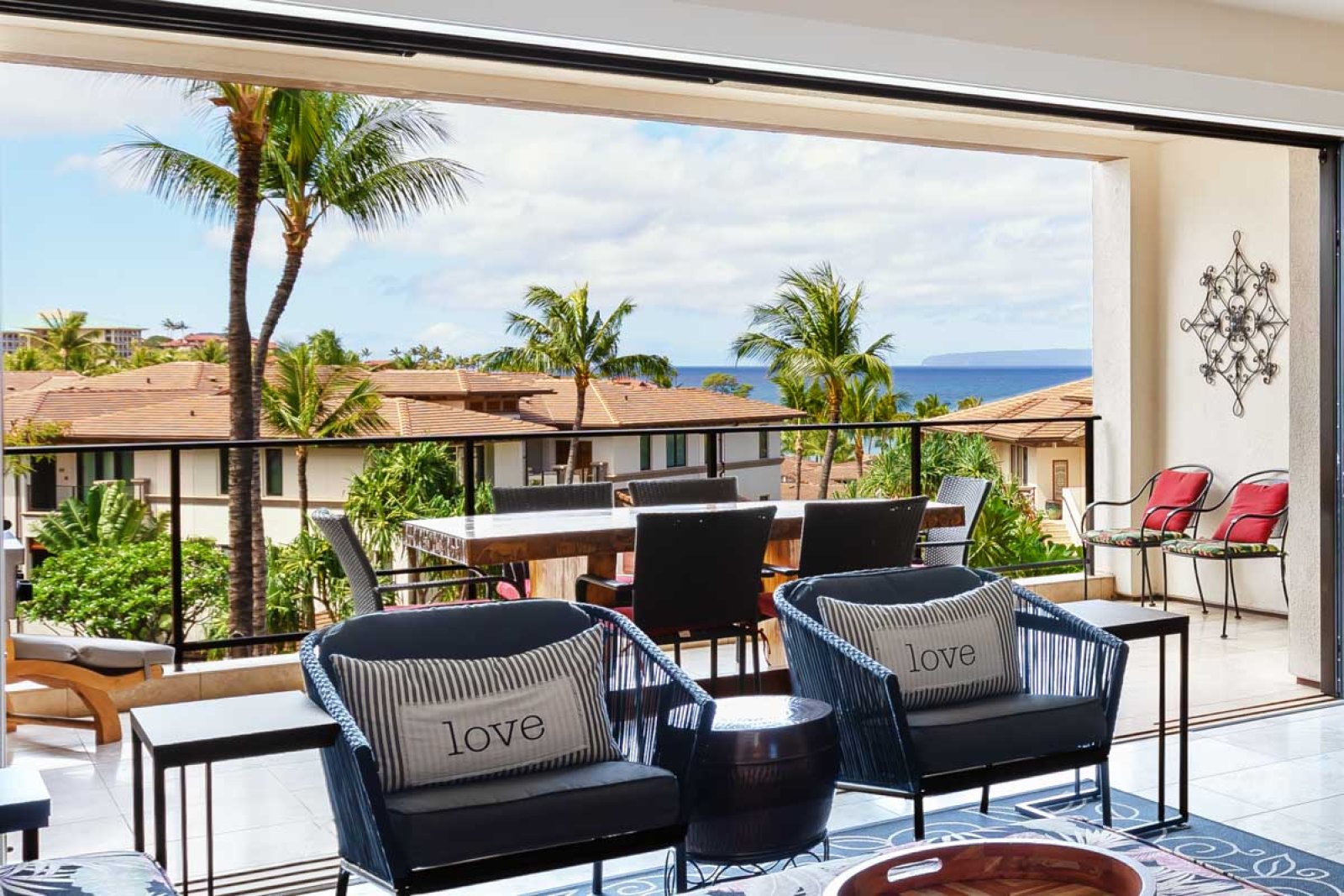 The private lanai provides a tranquil outdoor living space with seating for relaxing and enjoying the tropical surroundings. The built-in Viking grill makes outdoor dining easy, while the proximity to the family pool offers quick access to swimming and resort recreation.
