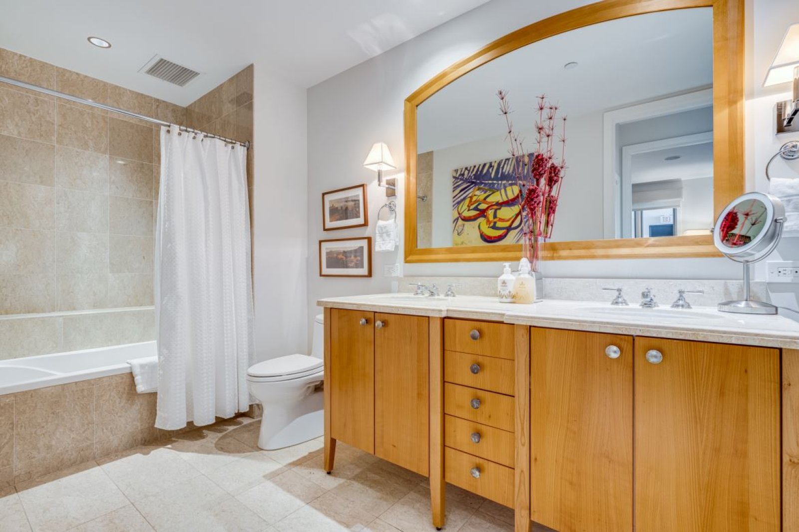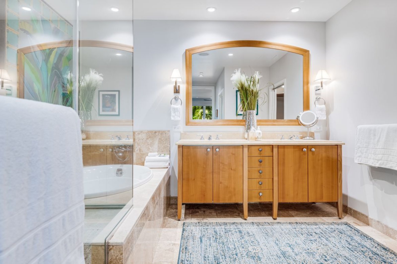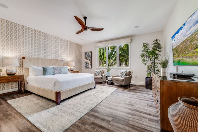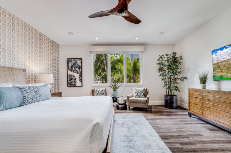 Wake to soft garden light and island tranquility in the primary bedroom, appointed with a king bed and large flat-screen TV. The spa-style en-suite bathroom features a dual vanity, soaking tub, walk-in shower, plush towels, and a bathrobe for an indulgent start or end to your day.