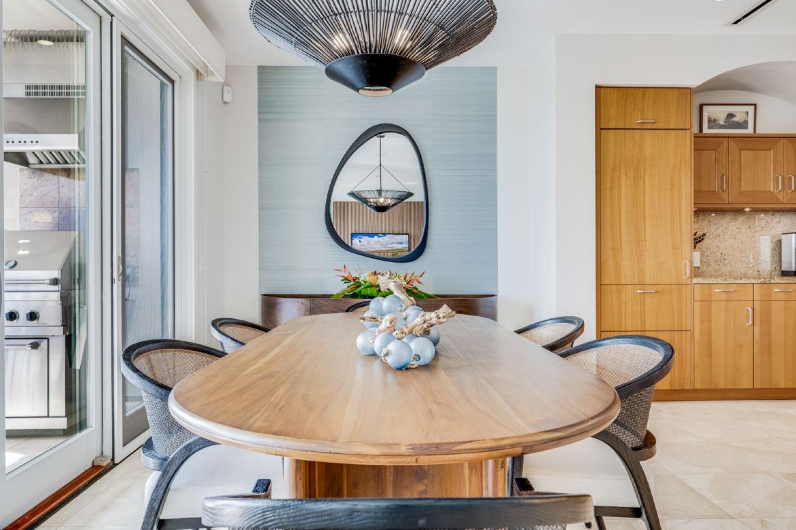 The gourmet kitchen is fully equipped for inspired home dining, featuring premium stainless steel appliances including a Gaggenau cooktop, Sub-Zero refrigerator, oven, microwave, and dishwasher. A specialty coffee maker completes the experience. Guests may dine casually at the kitchen island or gather around the dining table for relaxed, unhurried meals.