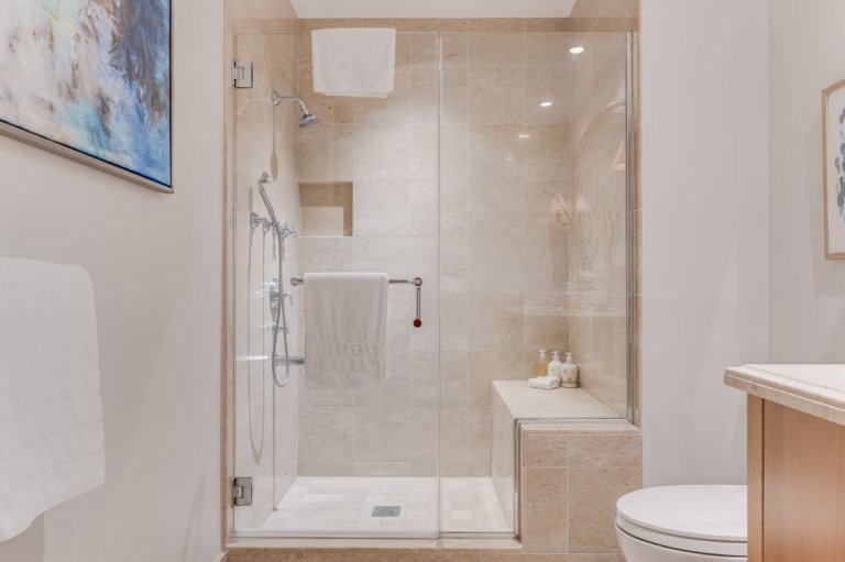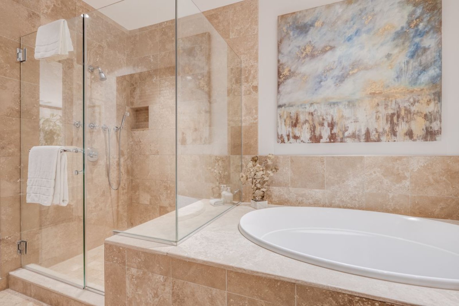 The primary bedroom features a king-size bed and a tranquil atmosphere ideal for rest and renewal. The en-suite bathroom is spa-inspired, offering a deep soaking tub, walk-in shower, and double vanity. A generous walk-in closet adds convenience for extended stays.