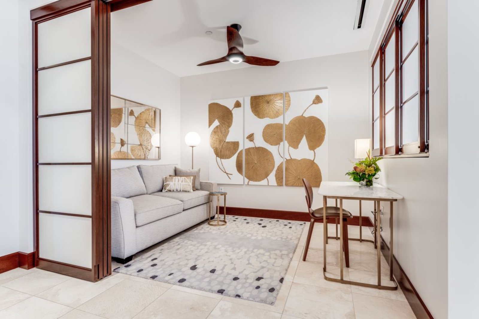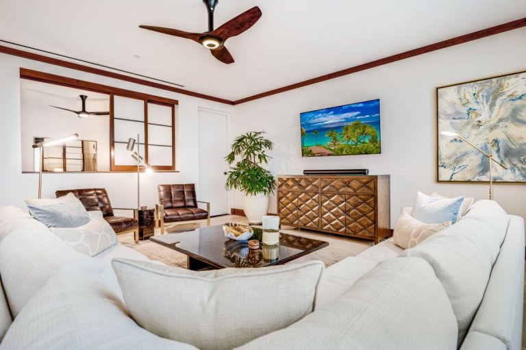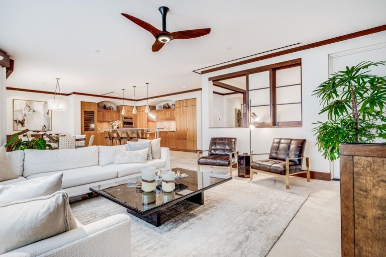 The expansive living and dining areas are beautifully appointed with island-inspired décor, curated furnishings, and refined finishes that create a welcoming yet elevated ambiance. Large windows and sliding glass doors invite natural light and ocean breezes, enhancing the connection between indoor comfort and outdoor beauty.