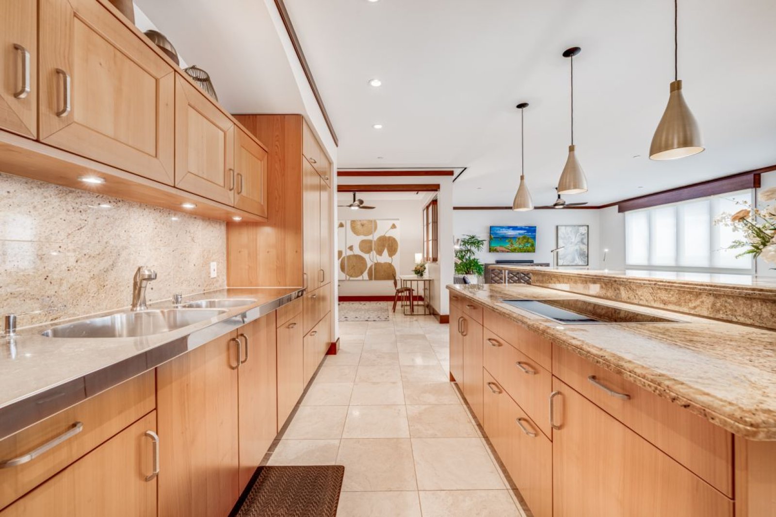 The gourmet kitchen is fully equipped for effortless entertaining, featuring a Sub-Zero refrigerator, Gaggenau cooktop, Thermador convection oven and microwave, Bosch dishwasher, and a complete suite of cookware and small appliances. Whether preparing a casual breakfast or a multi-course dinner, the kitchen flows easily into the formal dining area or out to the lanai for al fresco meals.