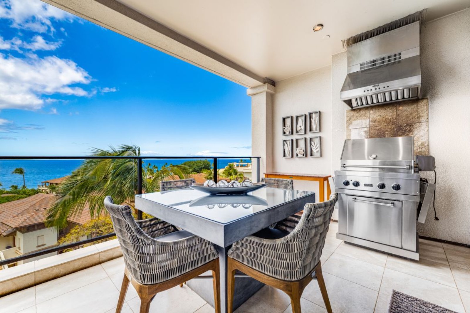 The private oceanview lanai is a highlight of Penthouse 404. Outfitted with comfortable seating and a Viking barbecue grill, it is the perfect setting for morning coffee, sunset dining, or evenings spent enjoying the glow of the Maui horizon. Expansive views of the Pacific Ocean, Molokini, and Kahoʻolawe elevate every moment outdoors.