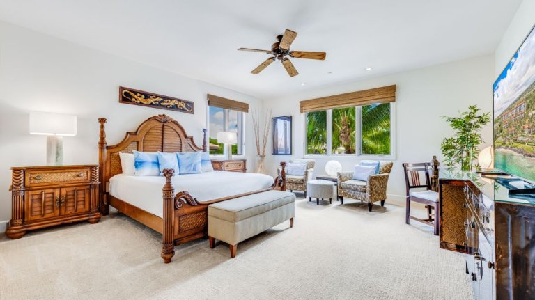 The primary bedroom is designed as a calming retreat, furnished with a king bed, elegant case goods, tropical plants, and a full-length standing mirror. A private sitting area offers space to unwind, read, or plan the next day’s adventures. Views extend across lush gardens toward Haleakalā, creating a serene backdrop. The en-suite bathroom is spa-inspired, featuring a deep soaking tub, glass-enclosed shower with seating, and a double vanity with granite countertops and custom light oak cabinetry.