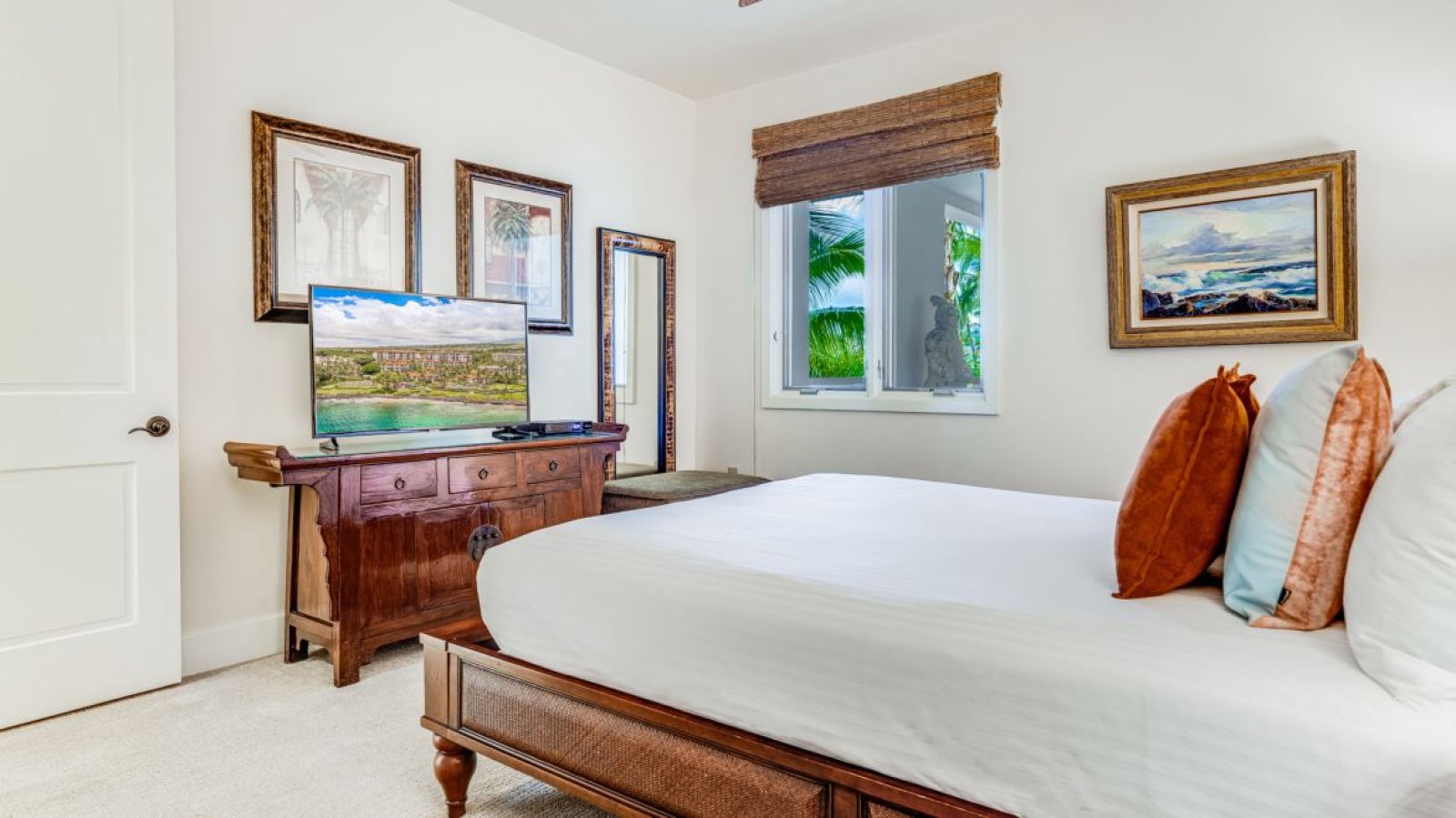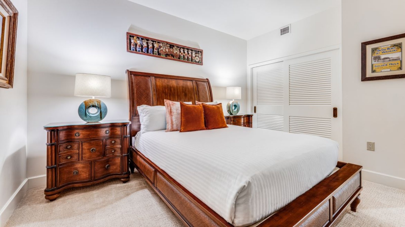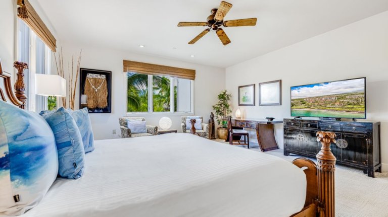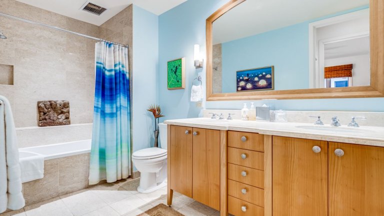 The second bedroom features a queen bed and tasteful Hawaiian décor. The adjoining bathroom offers a tub and shower combination, a double vanity, and hand-blown glass sconce lighting. Both bathrooms are stocked with plush towels and curated personal amenities, including shampoo, conditioner, soaps, and lotions.