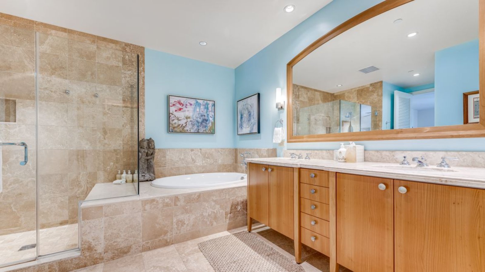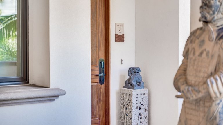 A life-size reproduction of a Chinese protection soldier welcomes guests near the semi-private elevator from the underground parking garage, while traditional Asian Foo dogs stand guard at the front door. These symbolic elements reflect the home’s globally inspired aesthetic and create a sense of peace, balance, and thoughtful design throughout the residence.