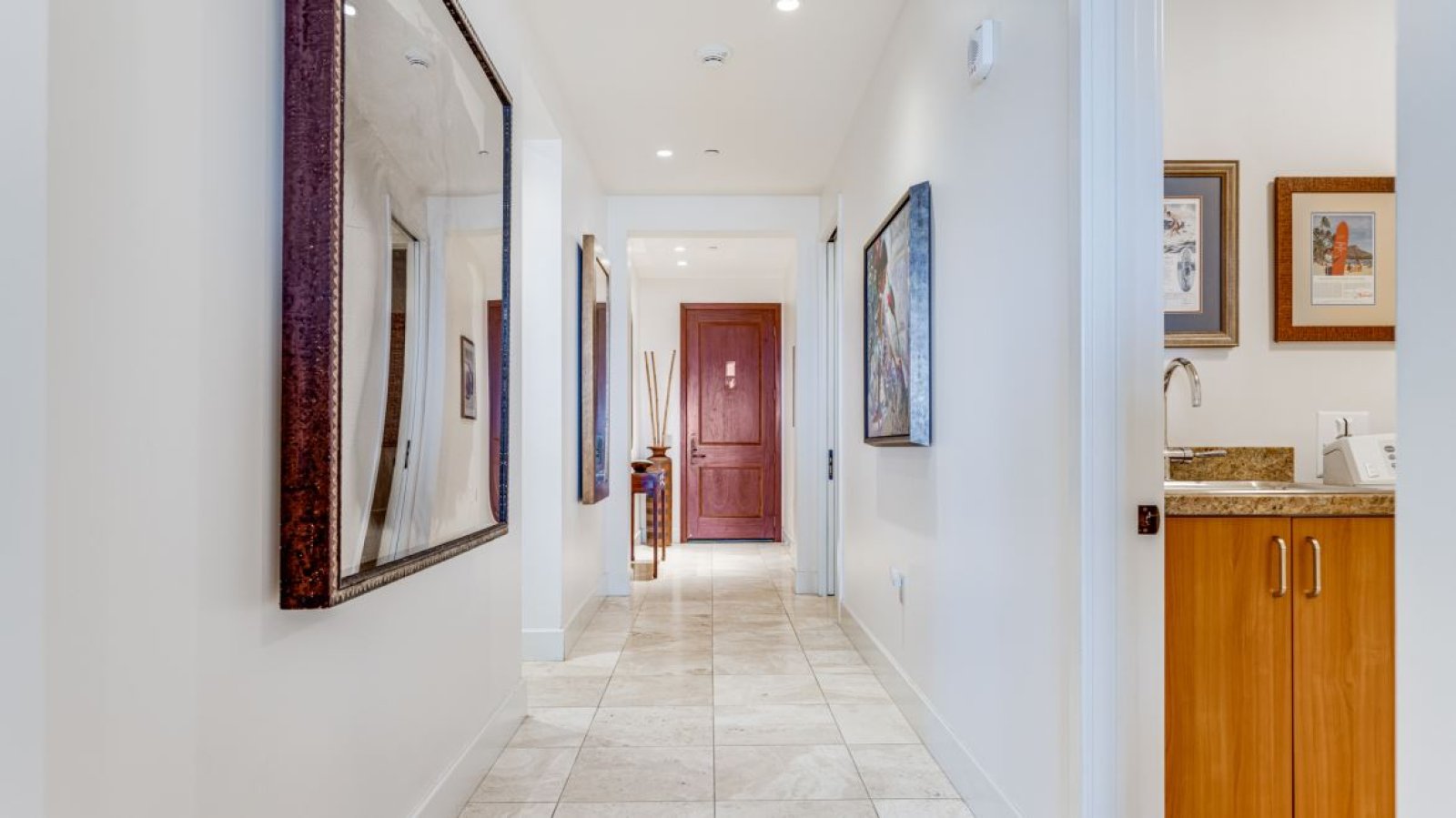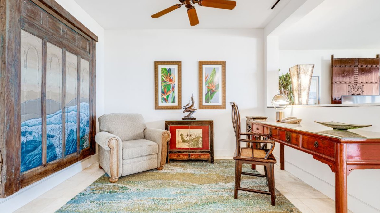Floor-to-ceiling sliding glass doors and expansive windows frame the ocean horizon and flood the residence with natural light. The interiors showcase an eclectic yet refined collection of Asian, Hawaiian, and Indonesian décor, including exotic hardwood furnishings, fine art, pottery, and carefully sourced antiquities that give the home its singular character.