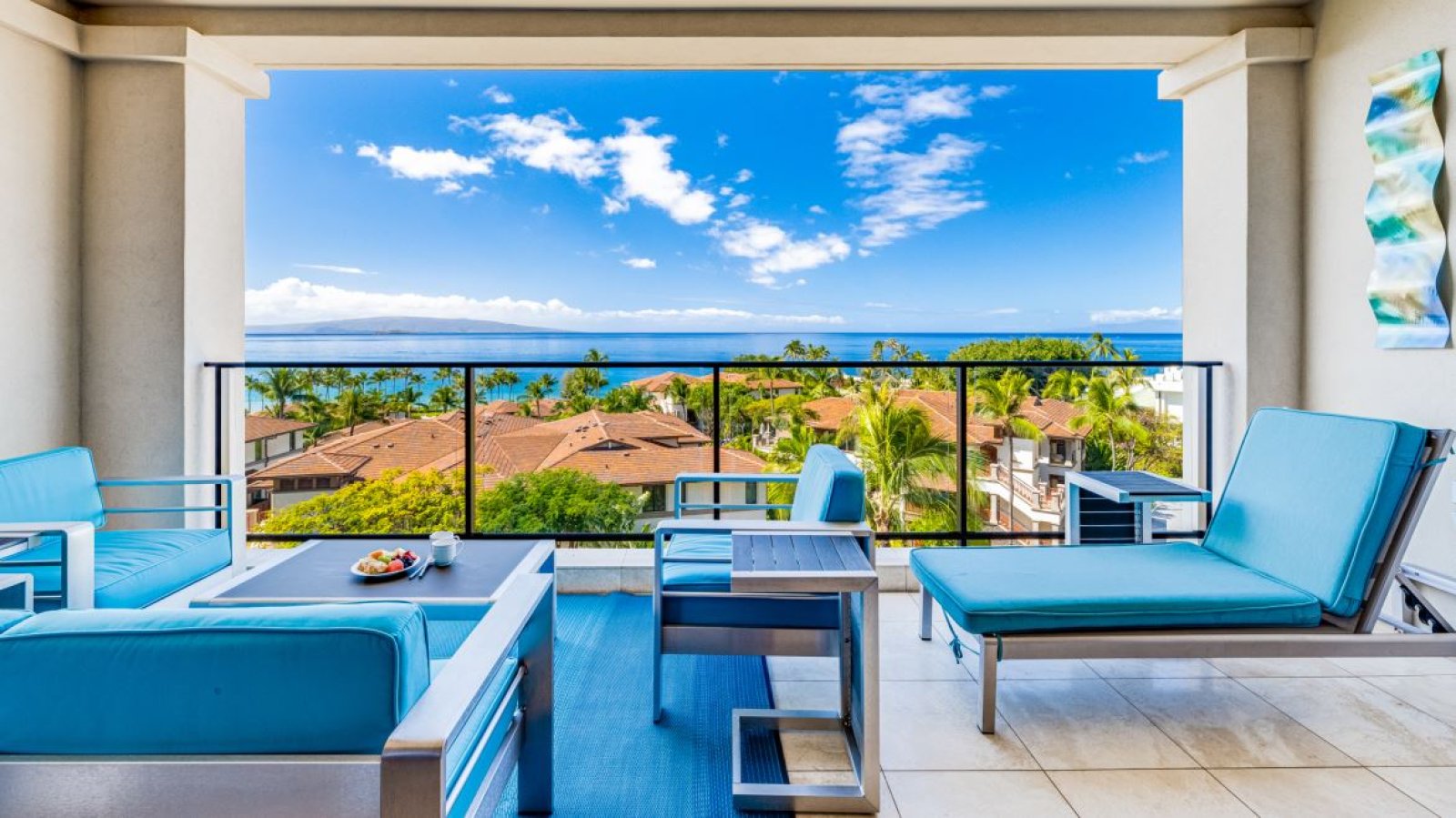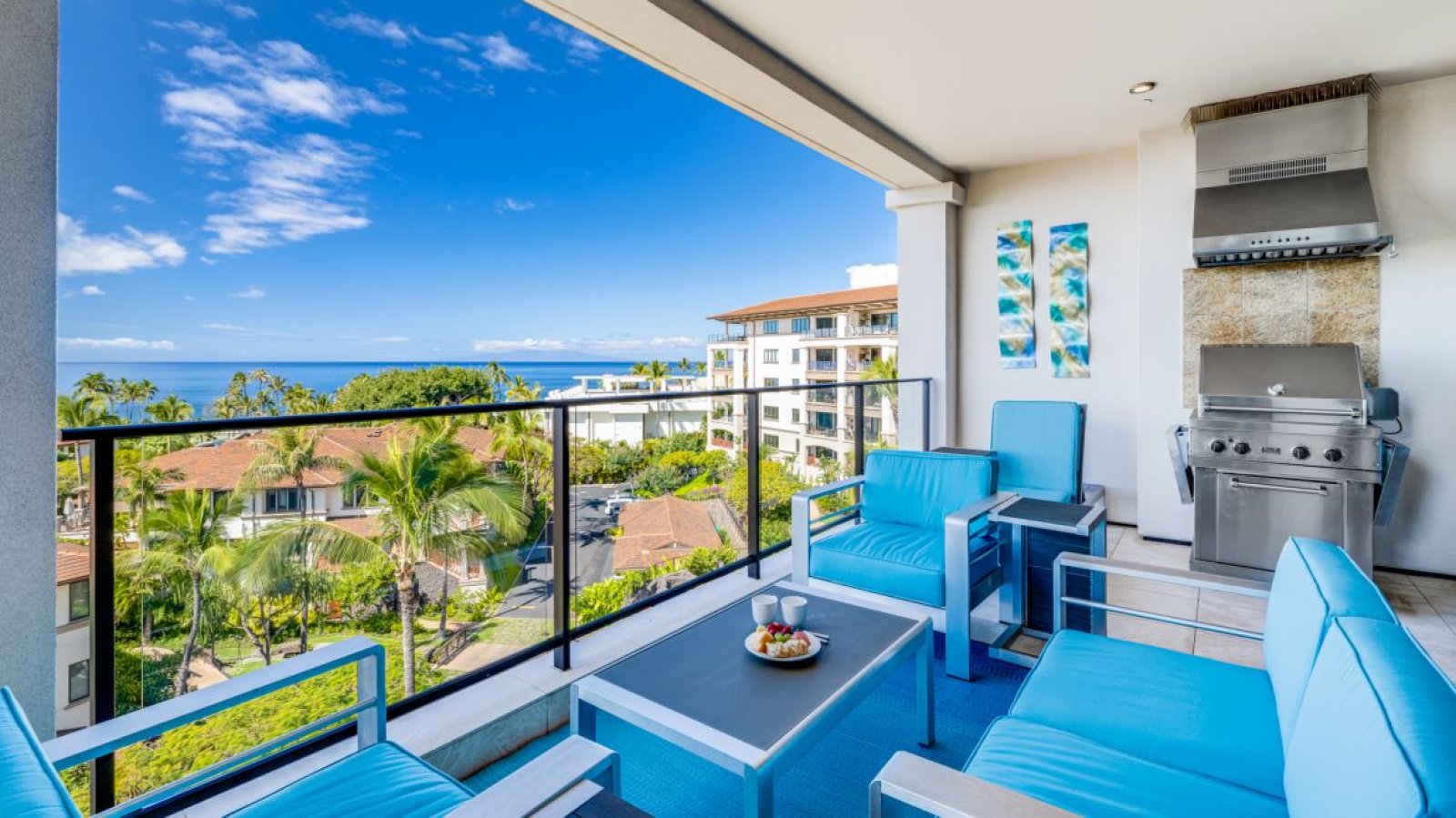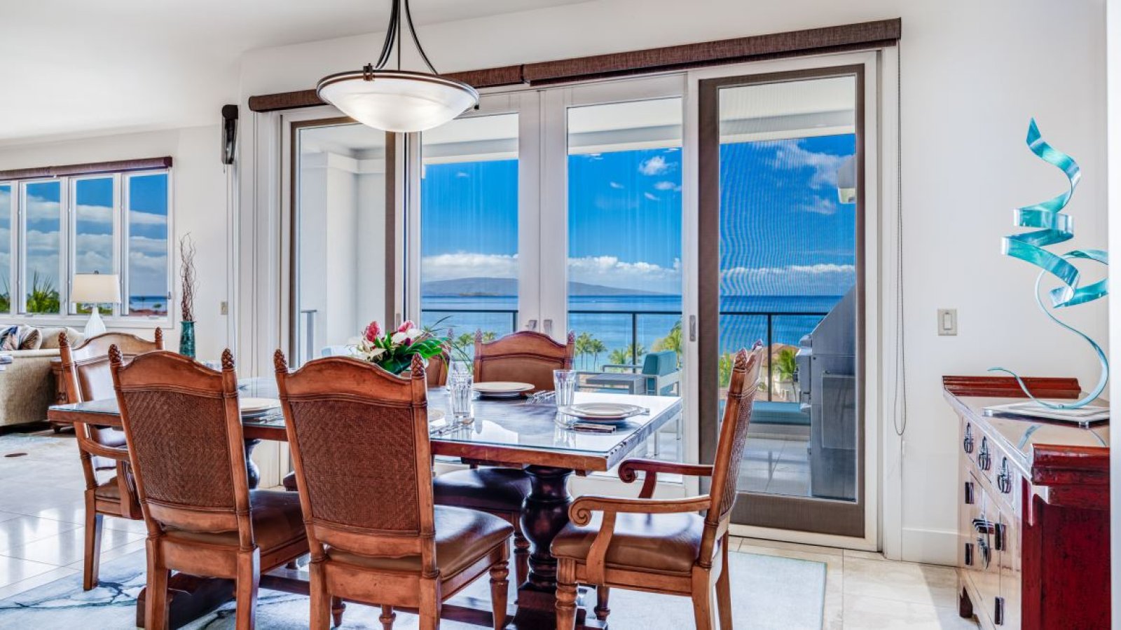 The oceanview lanai extends the living space outdoors, furnished with a dining table for four, a recliner lounge chair, and a Viking rotisserie grill. From sunrise to sunset, the lanai is an ideal vantage point for enjoying ocean breezes, open skies, and Maui’s vibrant evening colors.