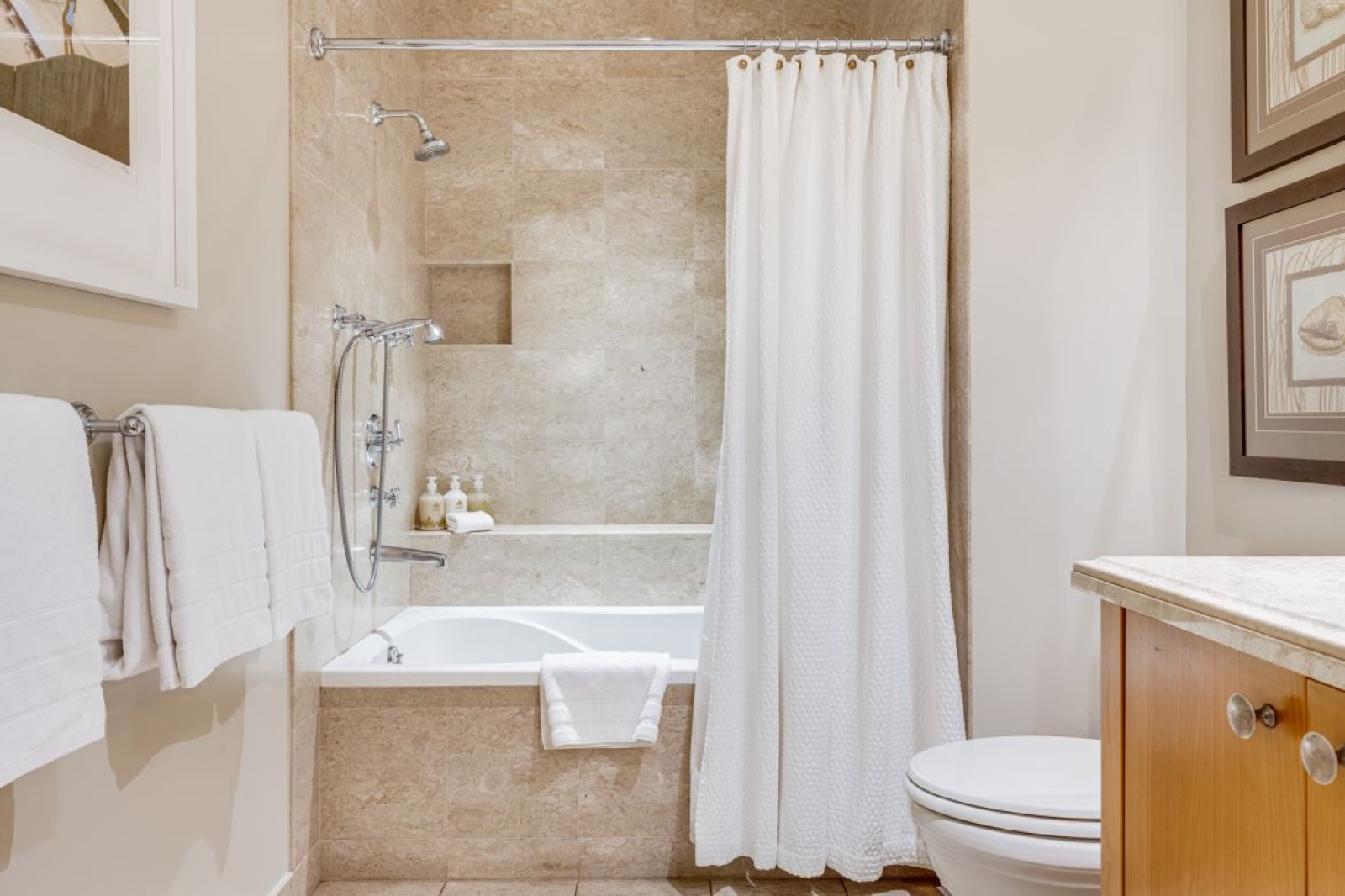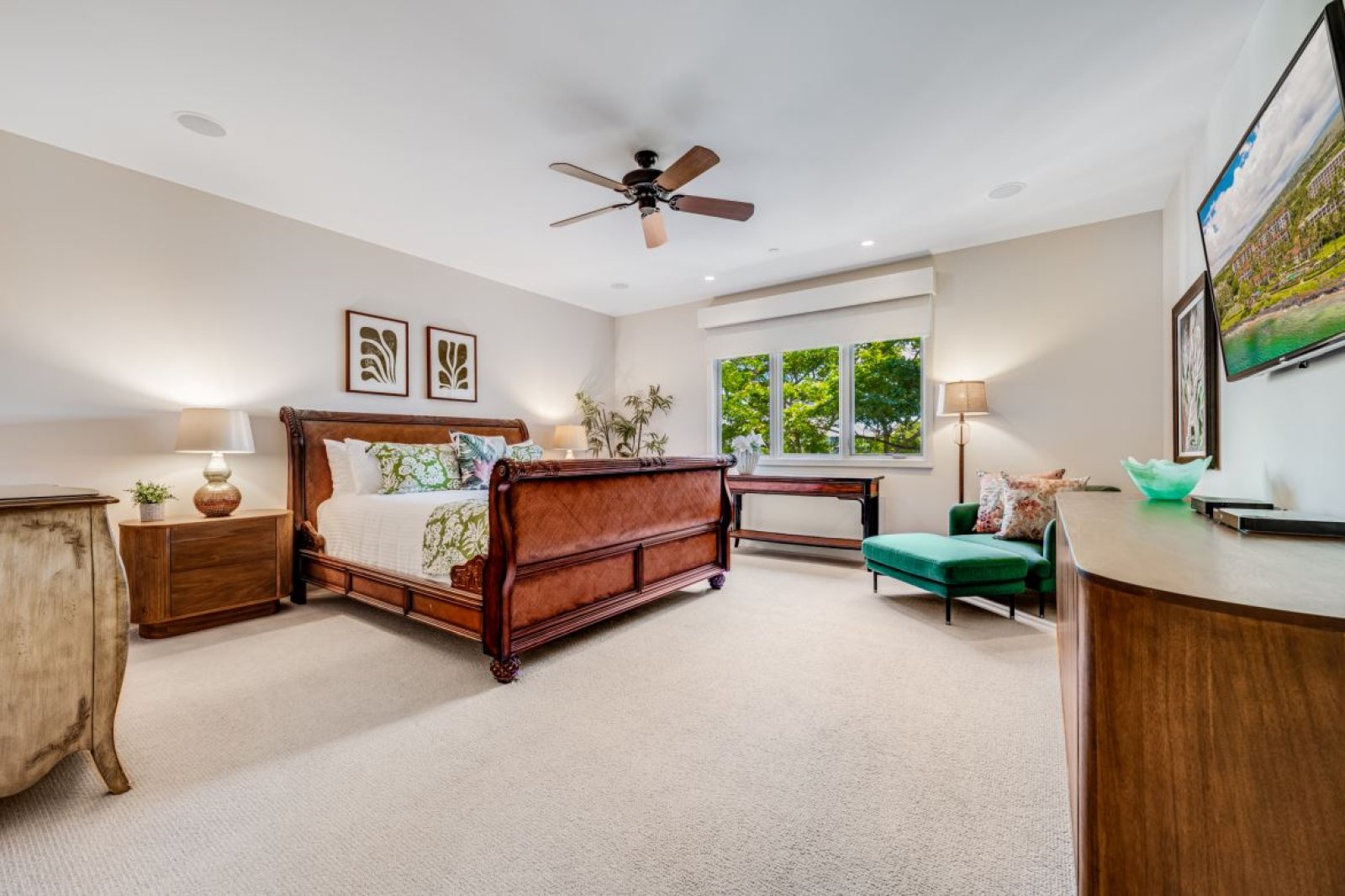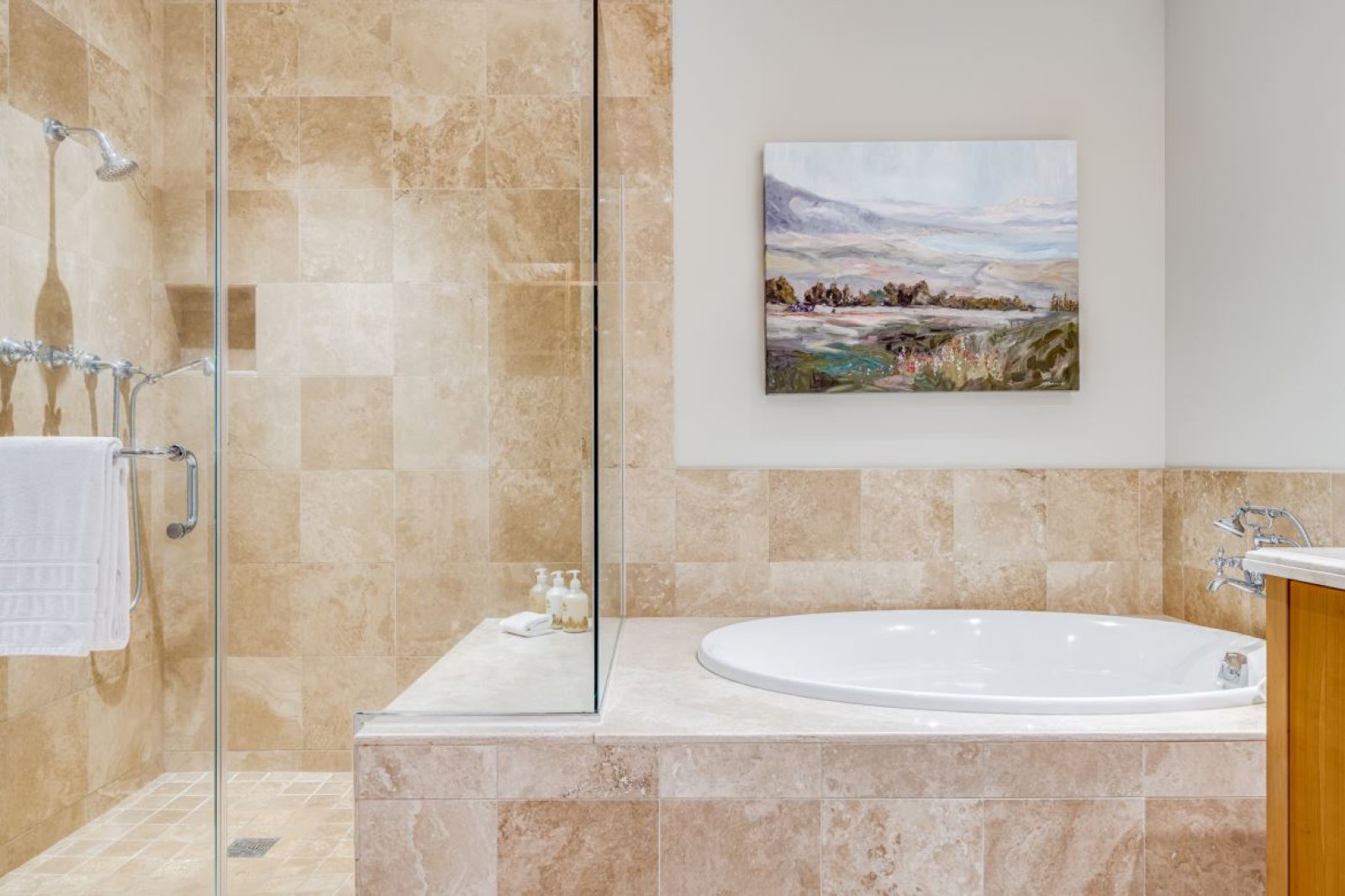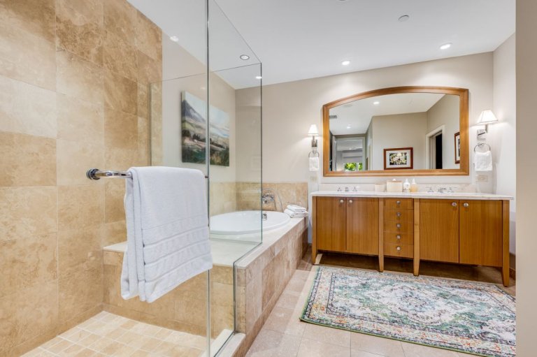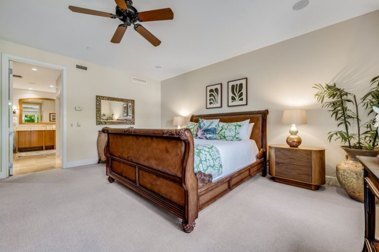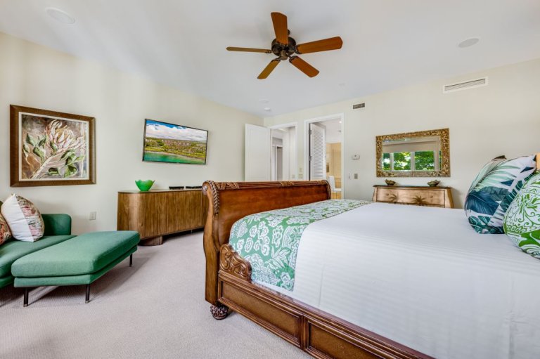 The primary bedroom is a serene retreat featuring a comfortable king bed, large flat-screen TV, and soothing island décor. The en-suite bathroom is spa-inspired, offering a deep soaking tub, glass-enclosed shower, and refined finishes designed for relaxation.