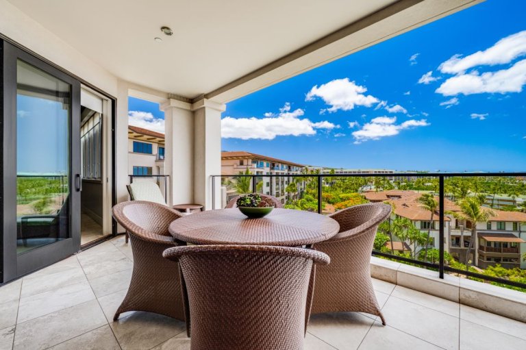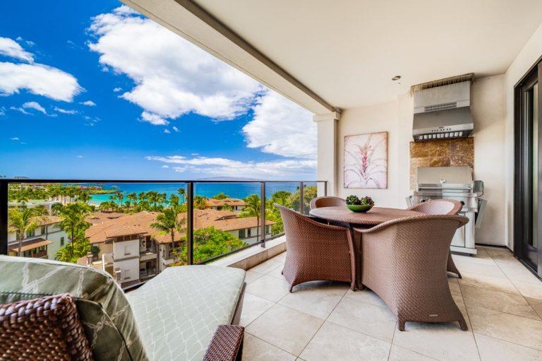 The private oceanview lanai is perfectly positioned to take in expansive views of the Pacific and Wailea Beach. Furnished for comfort and equipped with a Viking barbecue grill, the lanai is ideal for morning coffee, afternoon relaxation, or sunset cookouts surrounded by island breezes and glowing skies.