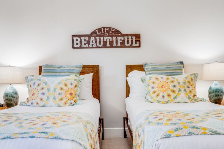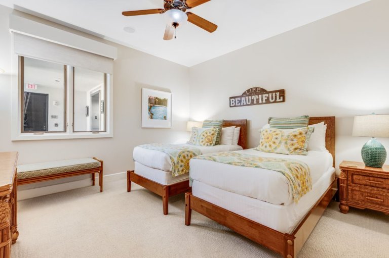 The second bedroom is furnished with two twin beds and a large flat-screen TV, providing a comfortable and versatile sleeping arrangement for additional guests or family members.