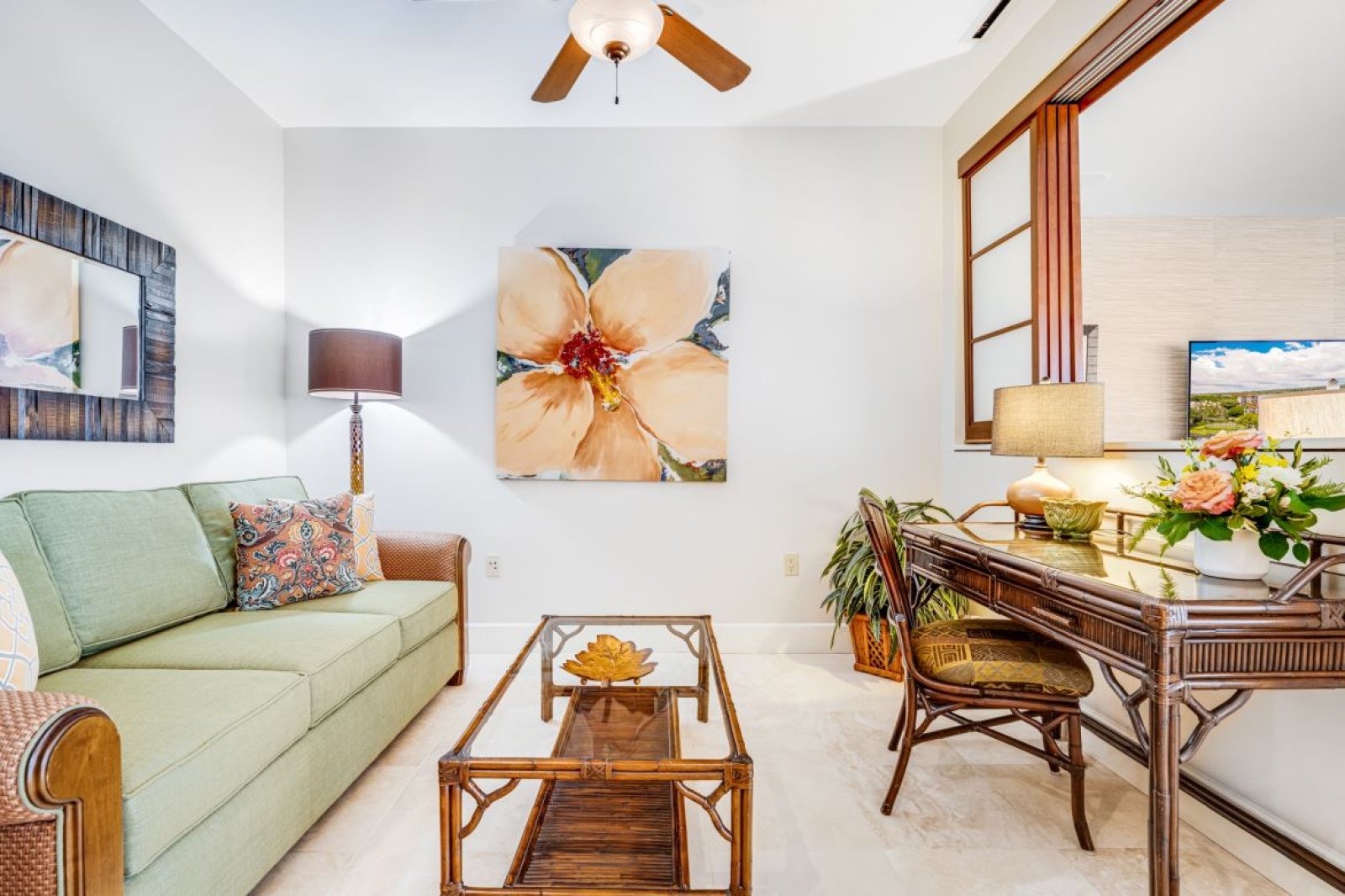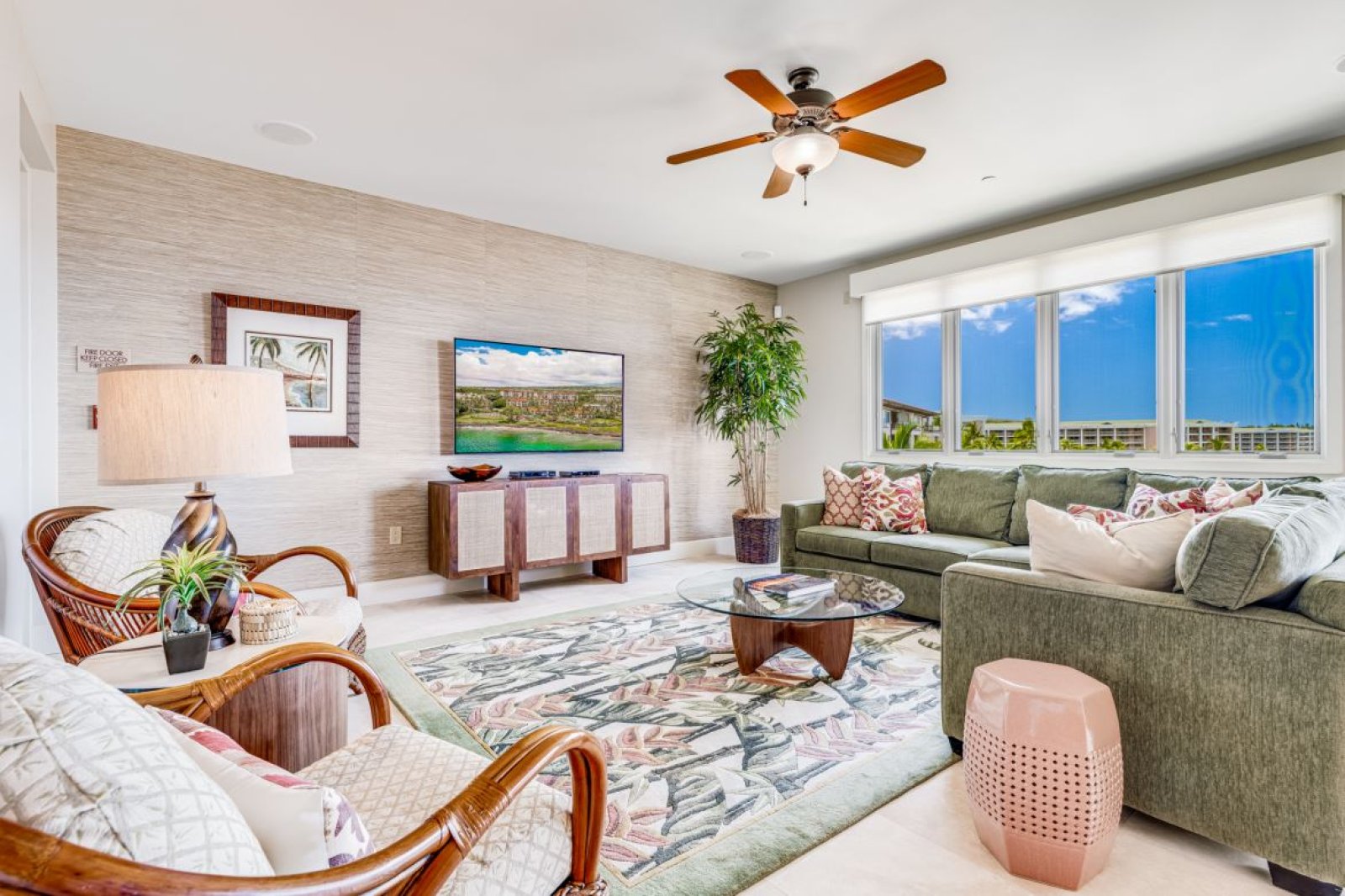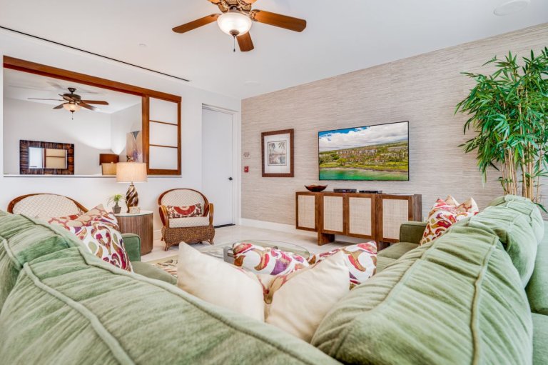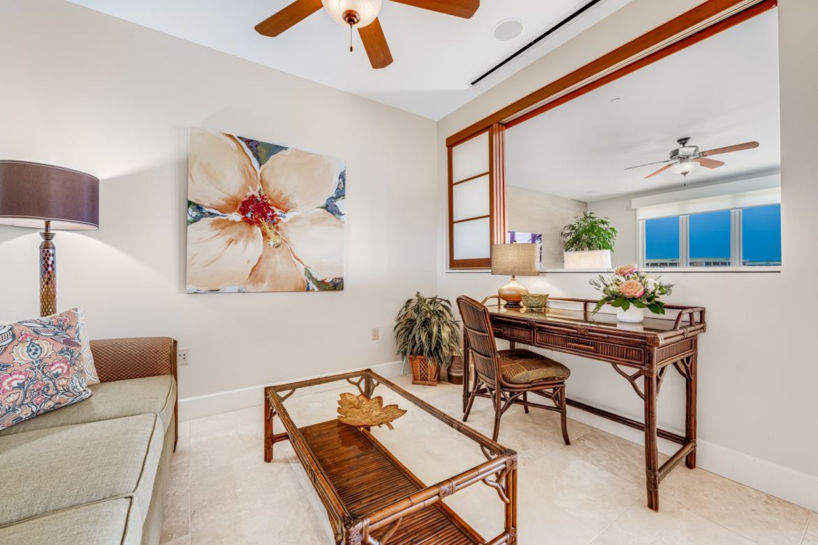 From the private elevator landing, a wide entry hallway leads past both bedrooms and into the expansive great room. The living area is generously proportioned and comfortably furnished, featuring a large flat-screen TV and plush seating arranged for relaxation or conversation. The décor reflects a classic island aesthetic, accented with bamboo cabinetry, traditional artwork, and refined finishes that feel both timeless and welcoming.
