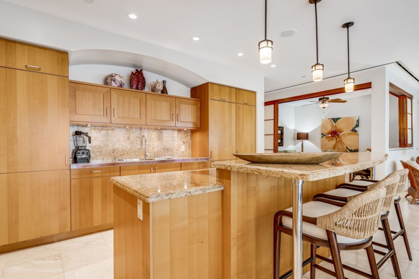 Opposite the living room, a formal dining area flows seamlessly into the gourmet kitchen, which includes a breakfast bar overlooking the lanai. The kitchen is fully equipped with modern appliances and granite countertops, making it equally suited for casual breakfasts or elegant dinners at home.