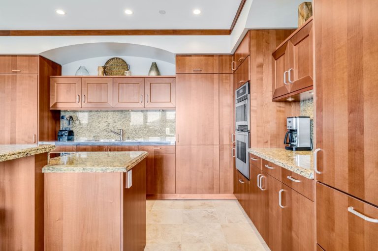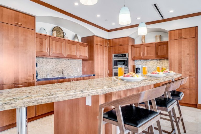 Fully equipped gourmet kitchen with granite countertops and modern appliances