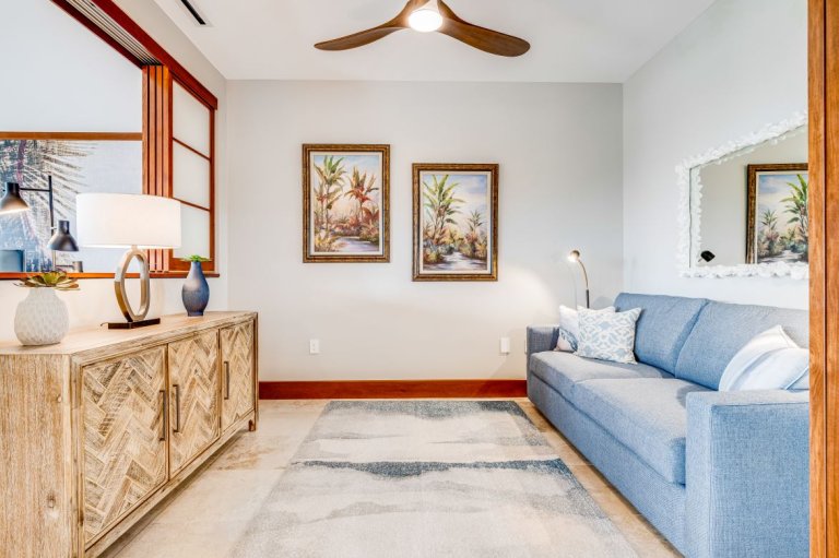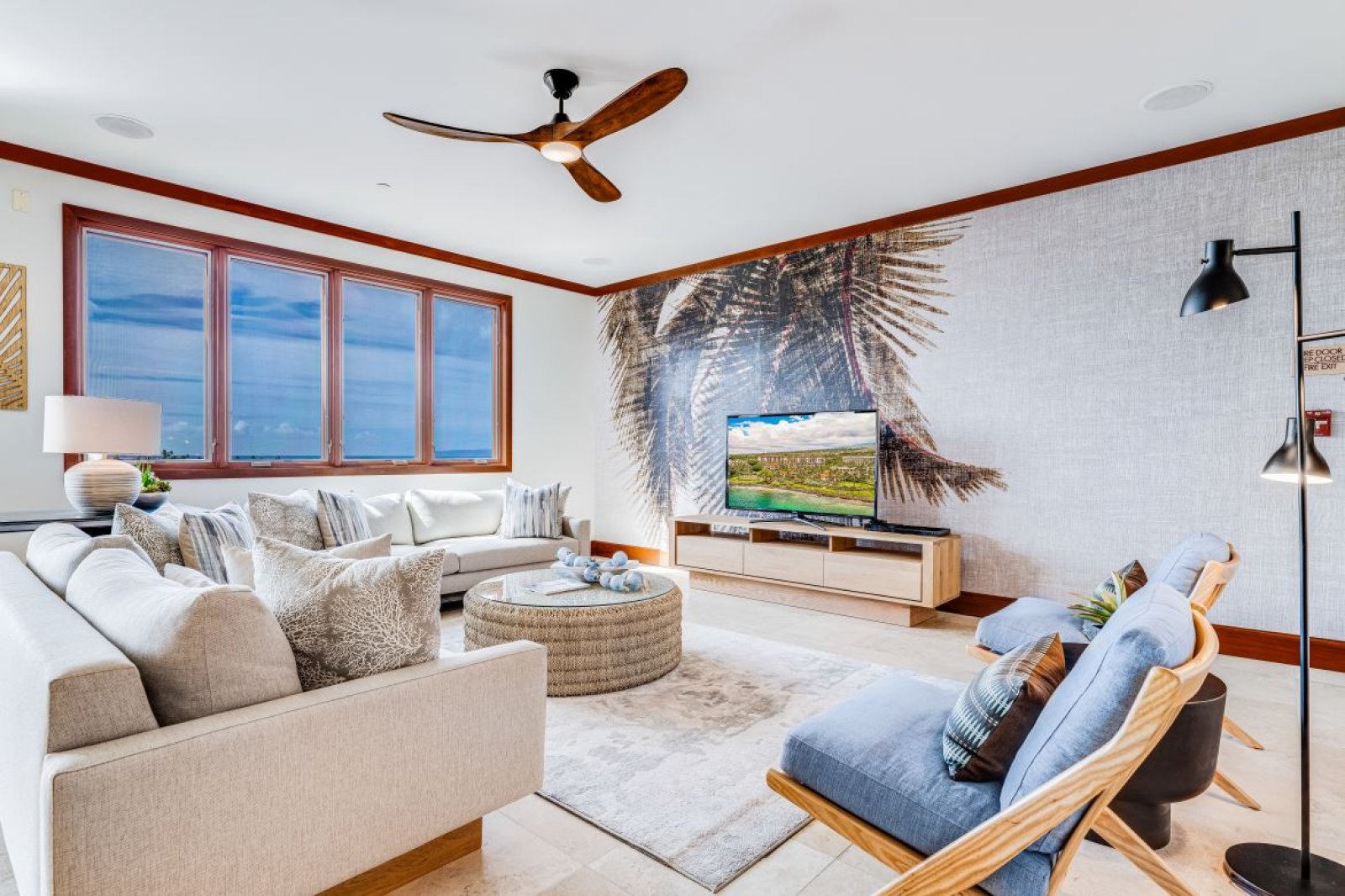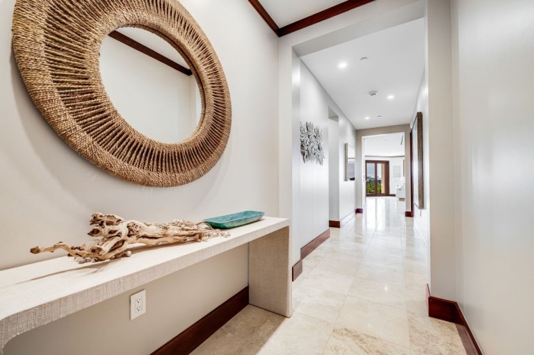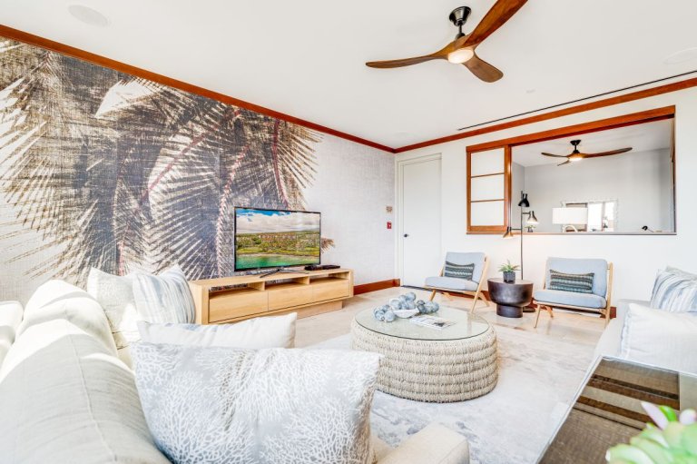 A wide entry hallway creates a gracious sense of arrival, guiding you past both bedrooms and into the expansive great room. The living area is comfortably appointed with plush seating and a large flat-screen television, ideal for relaxed evenings or gathering after a day at the beach. Classic island design elements are complemented by bamboo cabinetry, traditional artwork, and refined finishes that feel both warm and enduring.