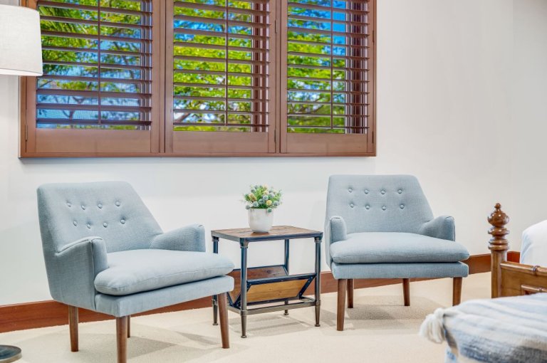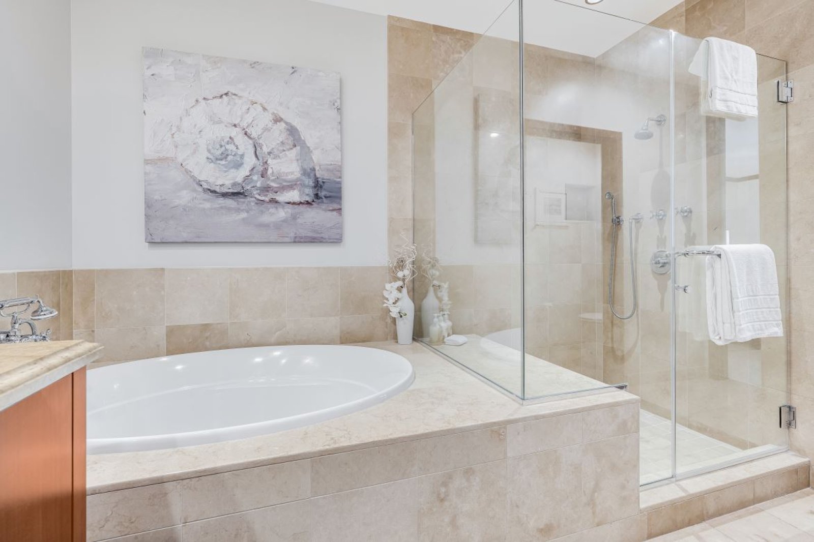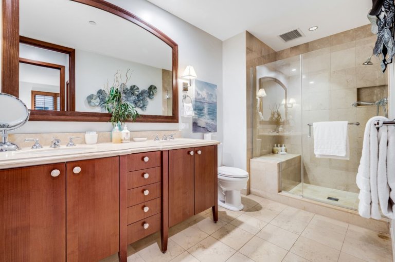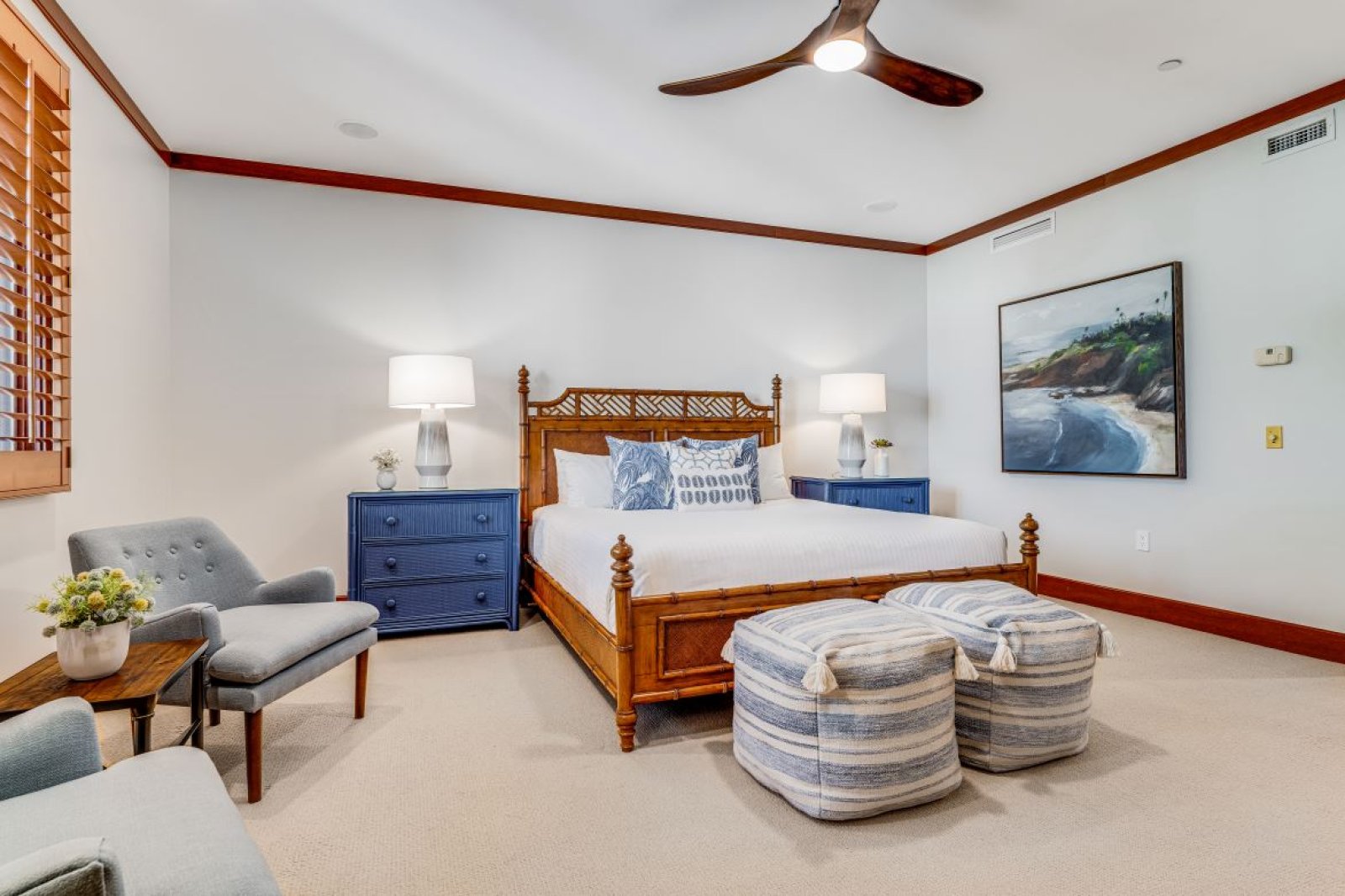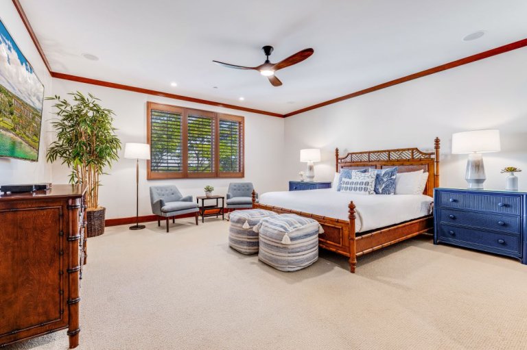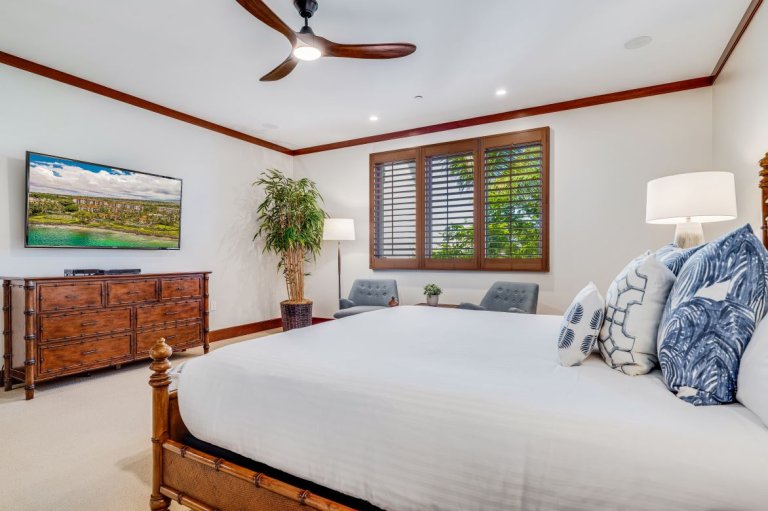The primary bedroom is a tranquil retreat with a king bed, large flat-screen TV, and soothing island-inspired décor. The en-suite bathroom offers a spa-like experience with a deep soaking tub, glass-enclosed shower, and refined finishes designed for relaxation.