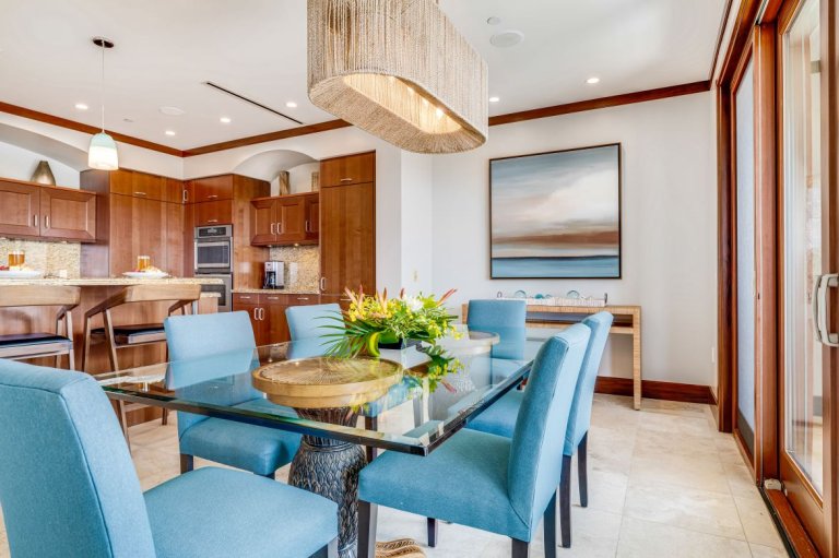 Adjacent to the living room, the formal dining area flows seamlessly into the gourmet kitchen. A breakfast bar overlooks the lanai, while granite countertops and modern appliances make the kitchen equally suited for casual meals or elegant in-residence dining.