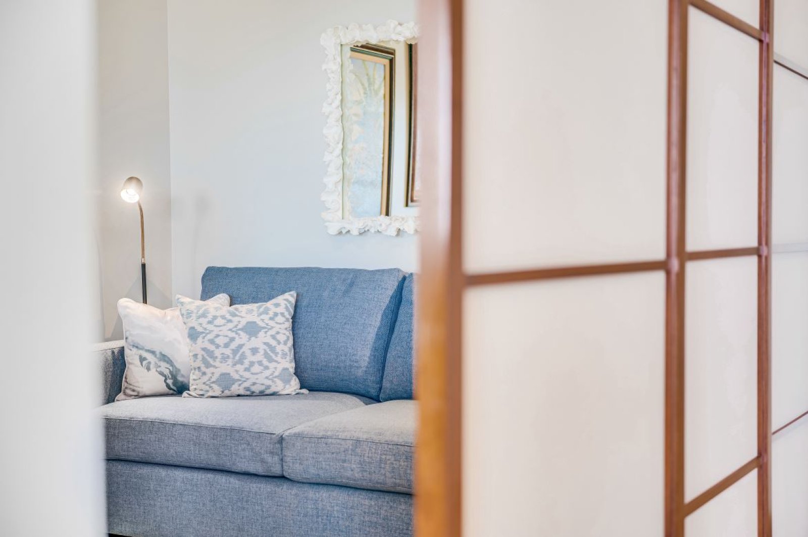 A semi-private den, separated from the living room by a half wall, features a writing desk and sofa. This versatile space may be curtained off for added privacy and works well as a quiet reading nook or workspace.
