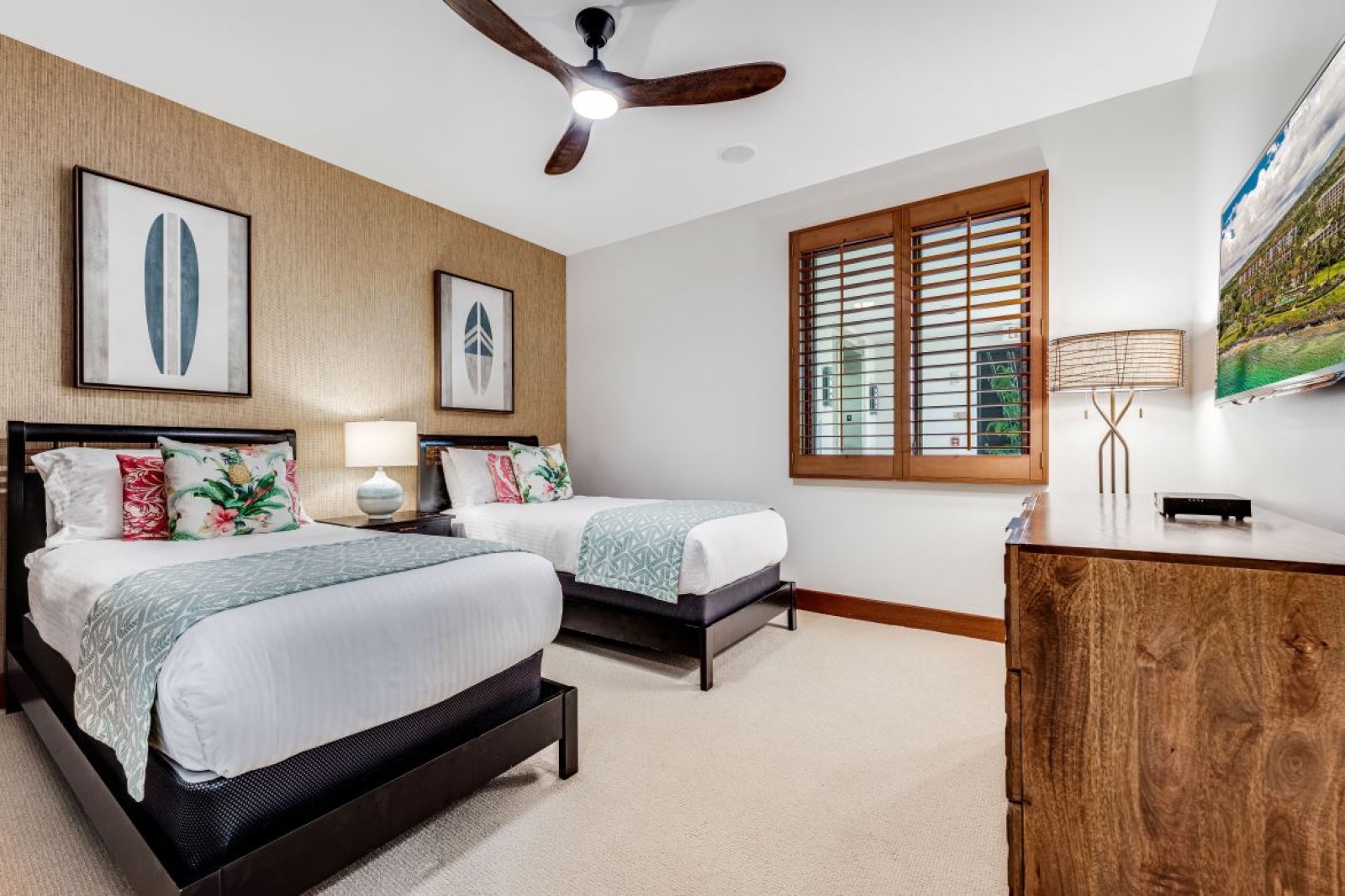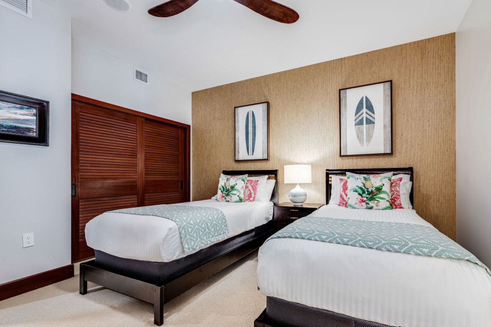 The second bedroom features two twin beds and a large flat-screen TV, providing flexible accommodations for family members or additional guests.