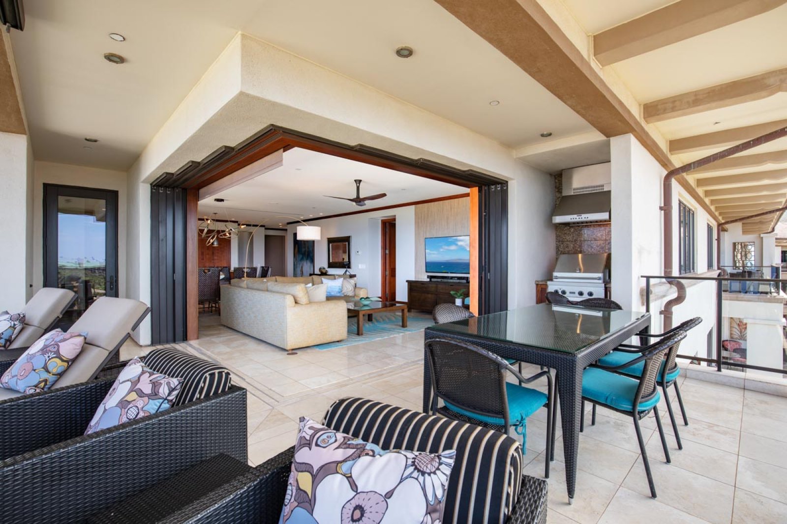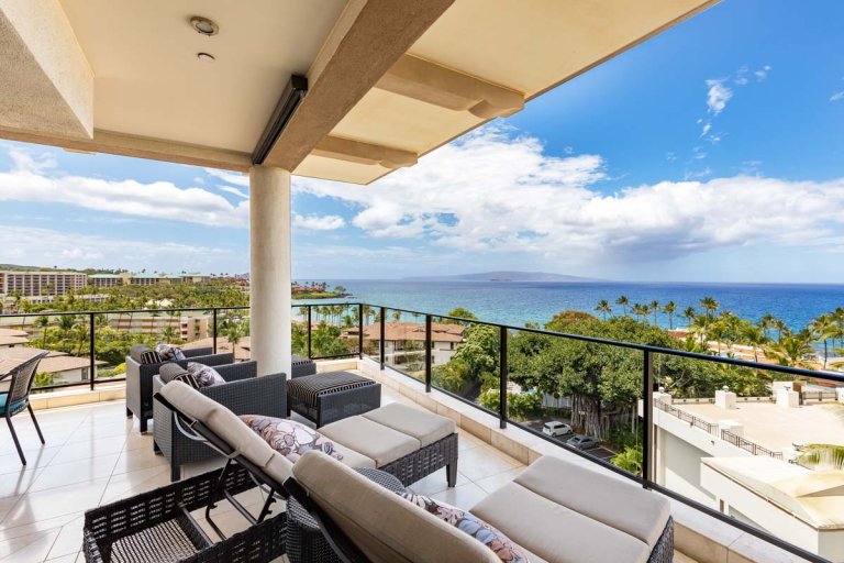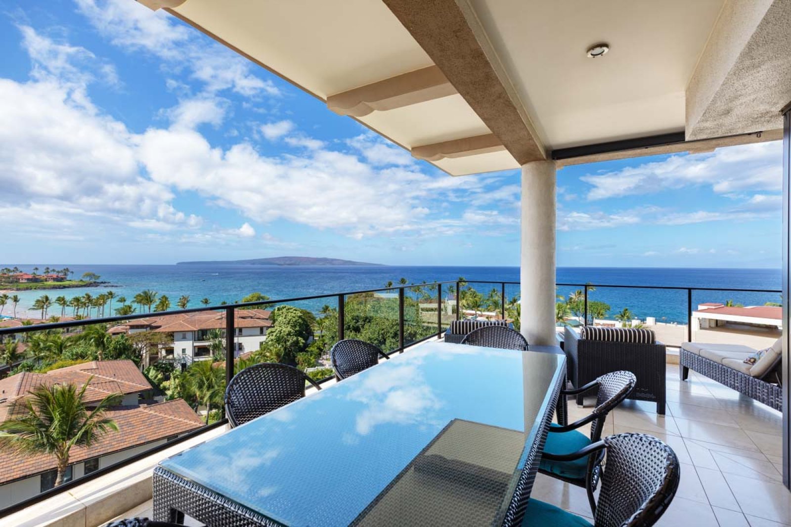 The wrap-around lanai offers one of the most impressive vantage points in Wailea, furnished for both relaxation and entertaining.• Panoramic ocean and island views