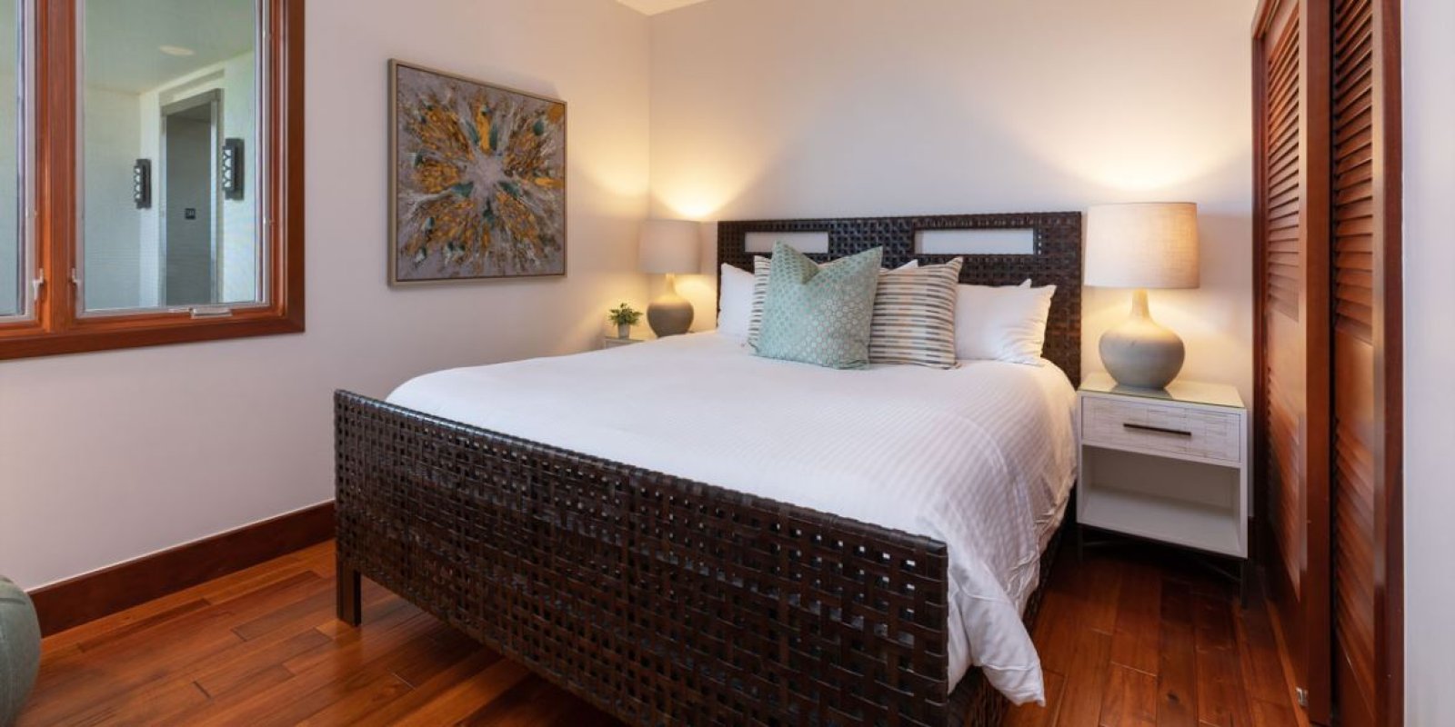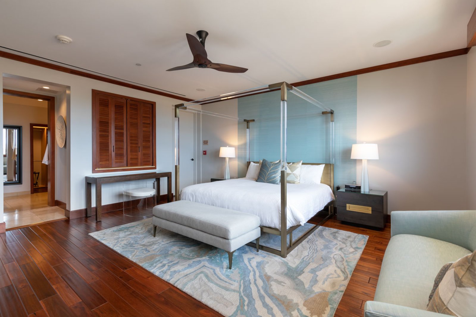 The open-concept living area connects seamlessly to the lanai, offering panoramic ocean views and a relaxed yet refined atmosphere. The spacious family room, dining area, and kitchen are thoughtfully arranged for gathering and entertaining. Large glass doors open fully to the outdoor living space, enhancing the sense of openness and connection to the island setting.Sleeping Accommodations | Sleeps Up to 6