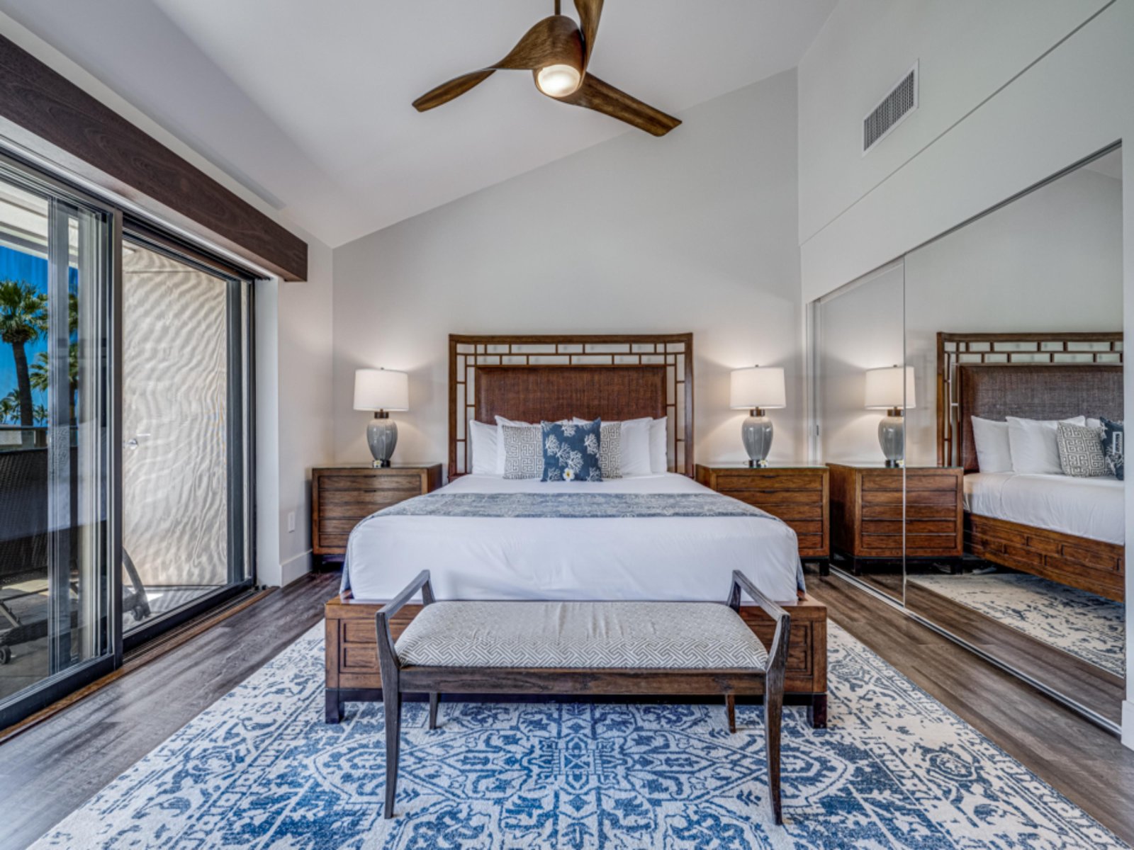 The master bedroom boasts a plush California King bed, ensuring a restful night's sleep. Two additional bedrooms feature a King bed and two Twin beds, respectively, providing ample space for family or friends. The condo features two full bathrooms, each with premium amenities for your convenience.